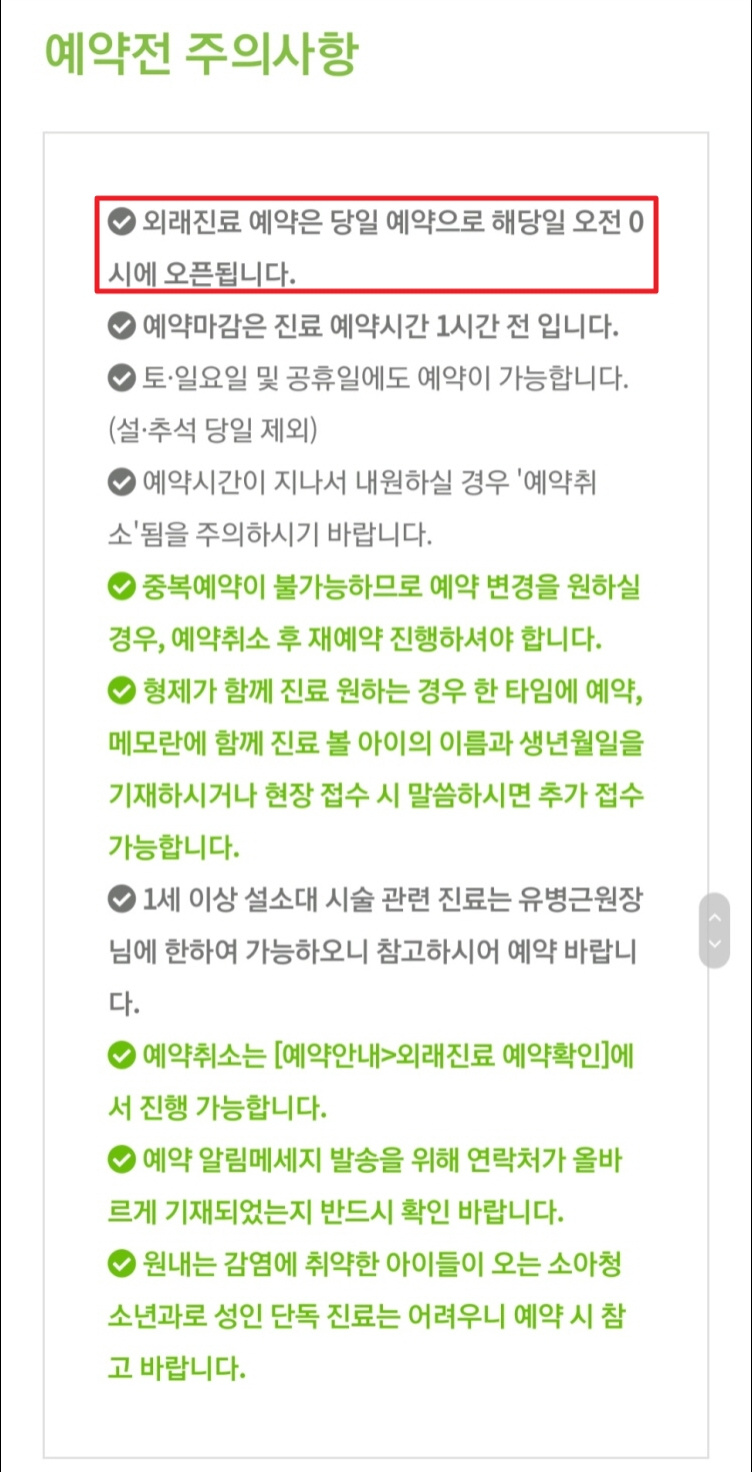 외래진료 예약하기를 클릭하시면 사전예약 주의사항이 나타나게 됩니다. 여기서 가장 중요한 것은 성북우리어린이병원 외래진료 예약 방법입니다. 여기서 포인트는 방문하고 싶은 날 전날 24:00 까지만 예약이 가능하다는 것입니다 . 예를 들어 1월 1일에 병원에 가고 싶다면 12월 31일 11시 59분부터 1월 1일 00시까지 예약한다면 됩니다. 따라서 예약하기 최소 5분 전에는 이 화면에 안전하게 액세스할 수 있습니다. 마치 인기 있는 콘서트 티켓을 사는 것과 비슷하죠?