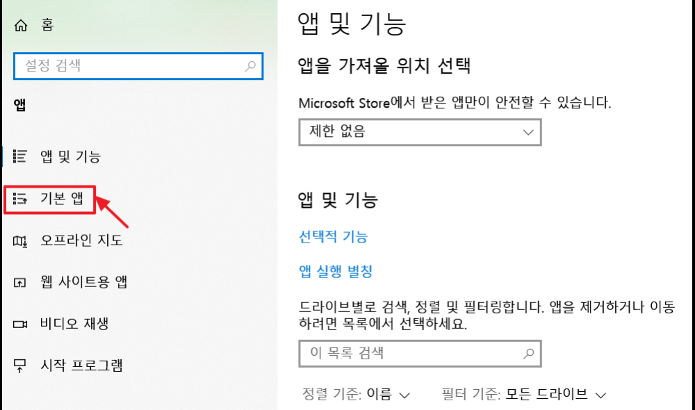설정을 이용하는 방법으로 앱 아이콘을 클릭합니다. 빨간색 사각형과 화살표를 참조하시기 바랍니다.